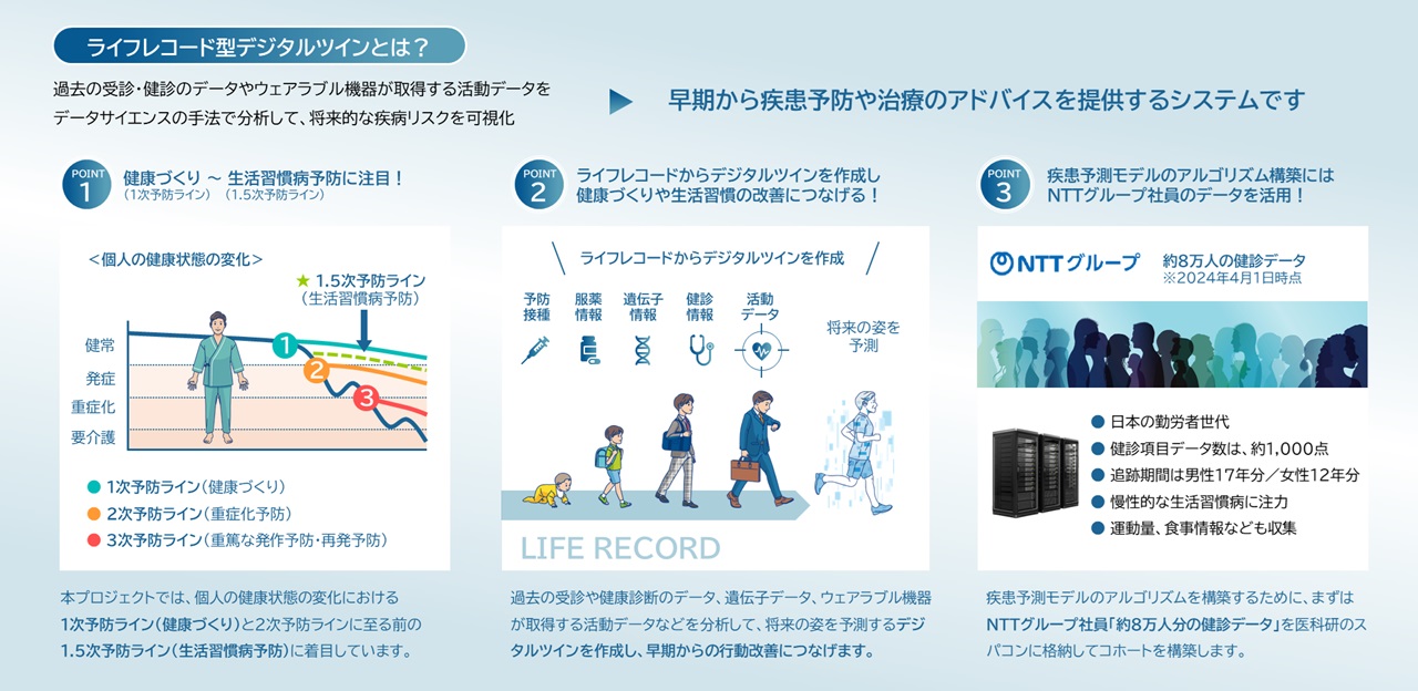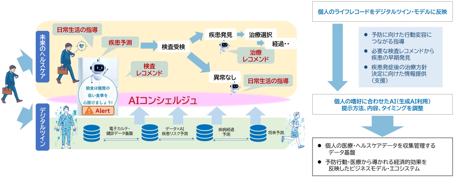 そして、このデジタルツインを活用することで、個人に最適化された健康維持、疾患の超早期発見、疾患発症後の治療選択から回復後のリハビリまで、若年・高齢と世代を問わず、最適なレコメンドや支援を得られるメリットを享受できる社会の実現をめざしています。